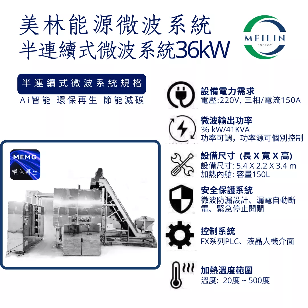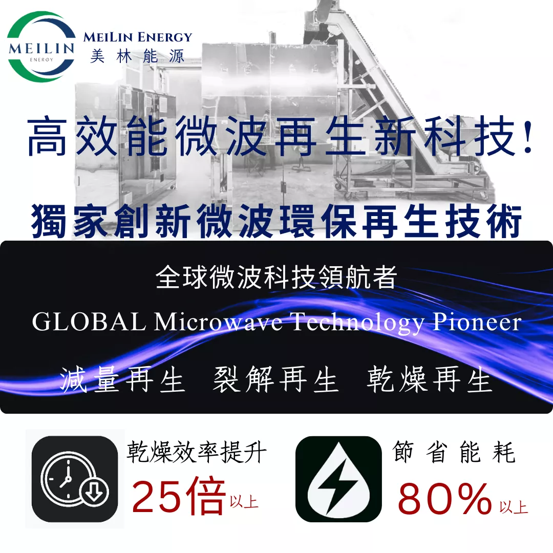 高效能微波再生新科技,美林能源微波環保再生技術,MEMG『 微波 + 裂解 + 再生 + 高效節能控制』,減少乾燥時間【25倍】以上,節約能源【80%】以上!
