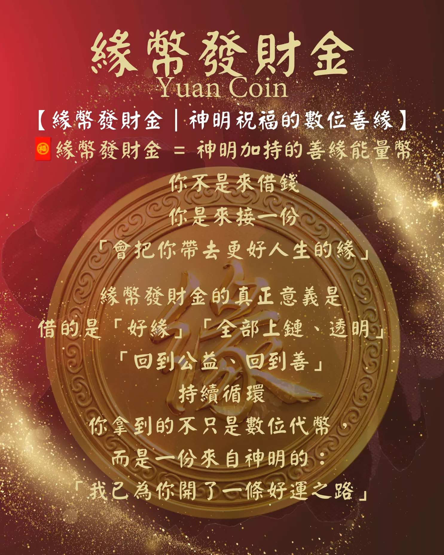 什麼是「緣幣發財金」? 緣幣發財金 = 神明加持的善緣能量幣,它不是投機幣,也不是炒作幣,它是一份被祝福、被紀錄、能循環的「善緣」!